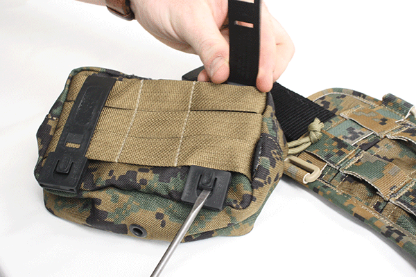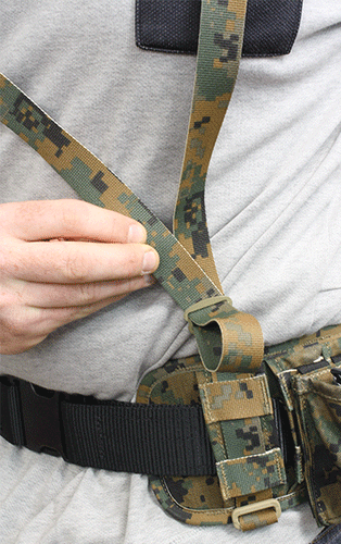 Start by weaving the webbing straps off the harness through the looploc’s on the top of the Hunters Belt