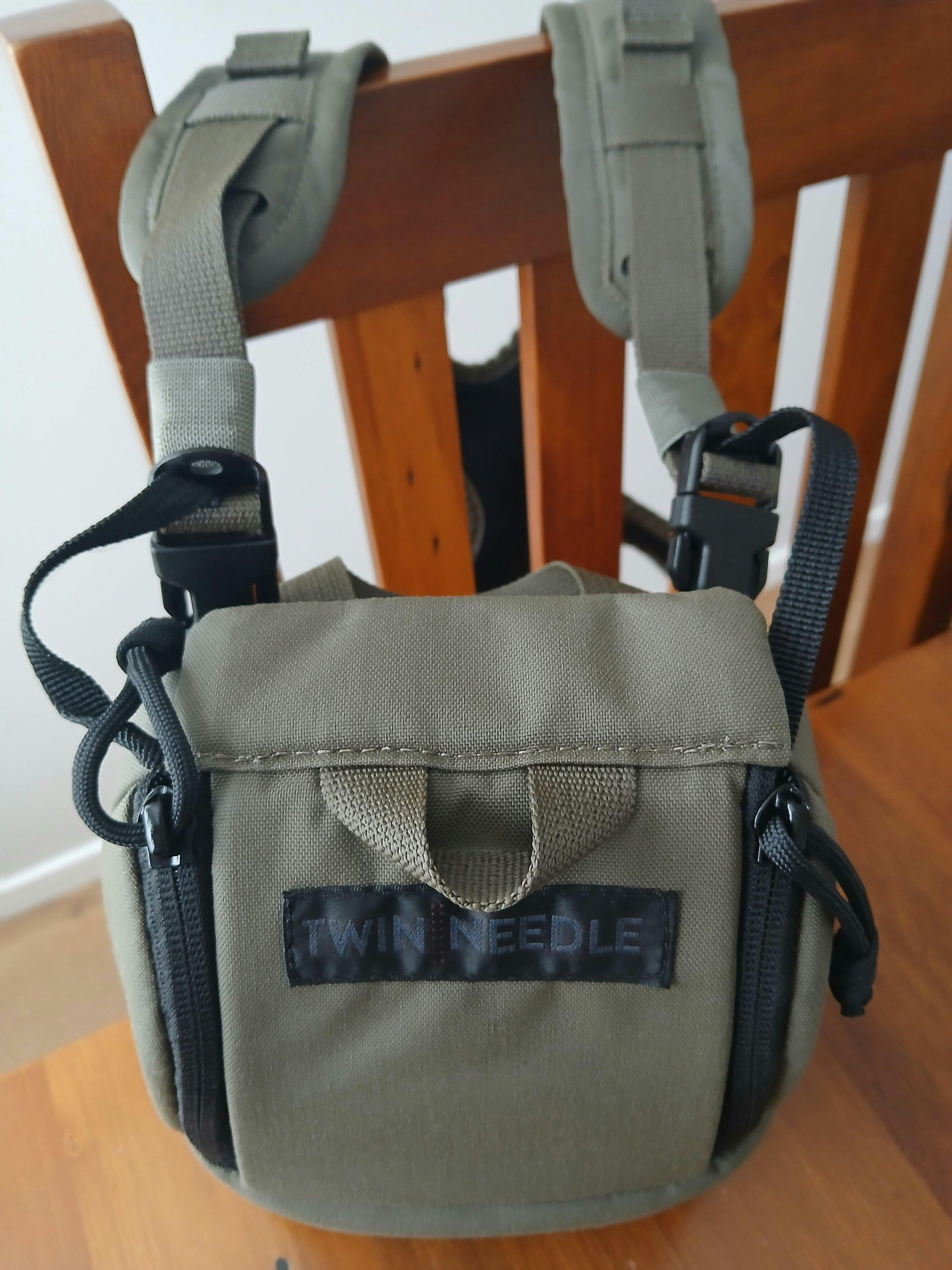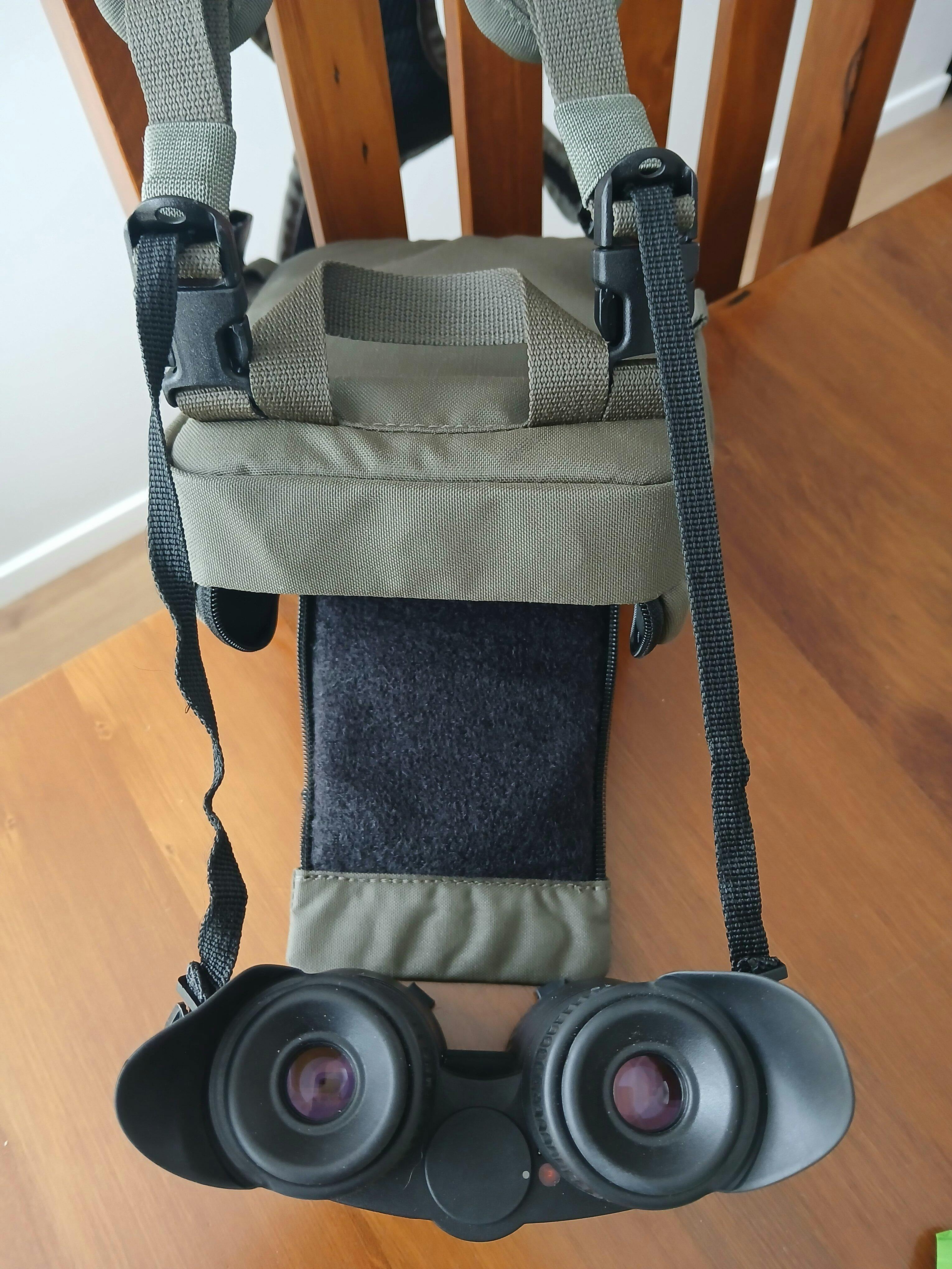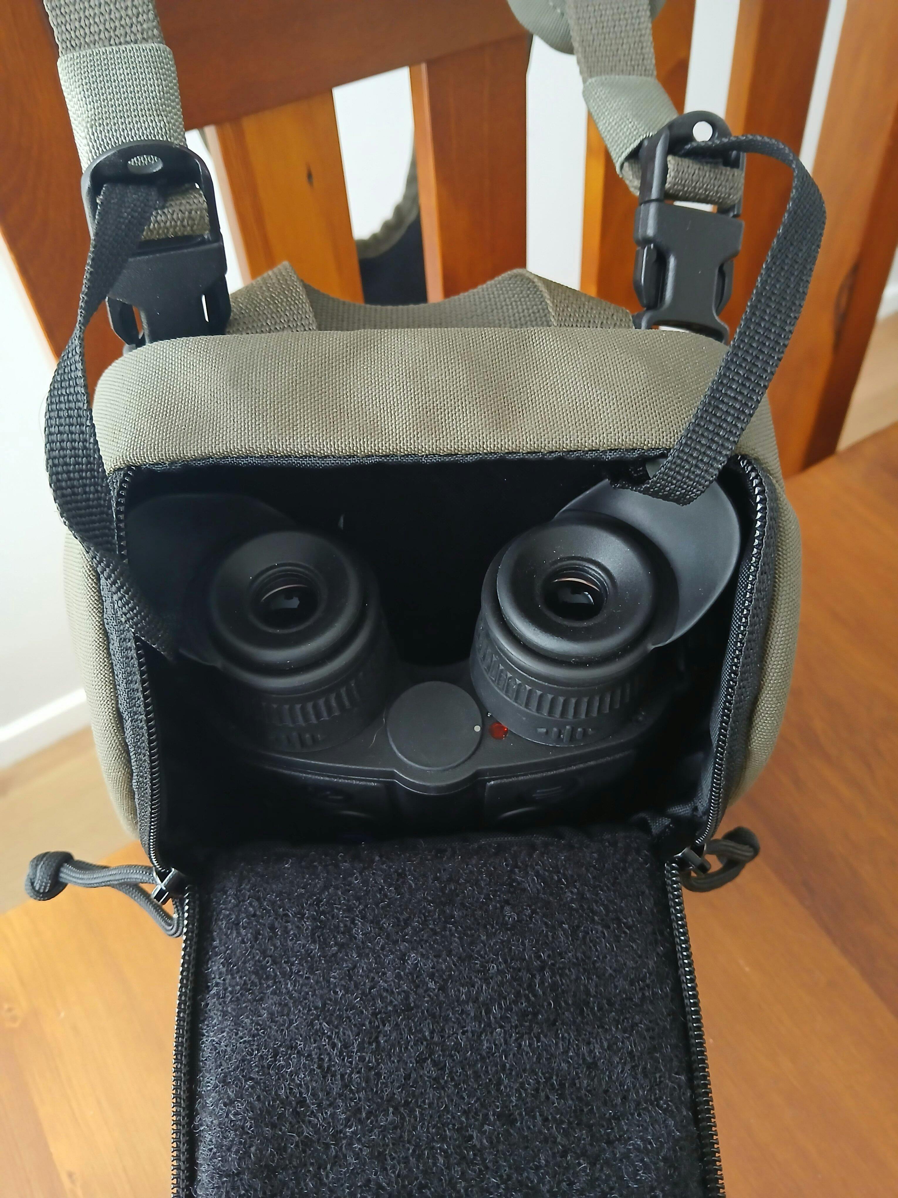 Mike L Brilliant pouch, sound construction & clean harness. Fits a pair of Pulsar Merger Thermal binos perfectly. Great padding and the secure zip system prevents them falling out when you're hunched over forward struggling through the gorse. Silent magnet closure when you're finished glassing. The short tethers on my Mergers looped securely into the top clips, removing the need for an additional neck strap and make for a clean setup. Harness is lightweight and clean, perfect as I already wear a pack when I'm hunting.